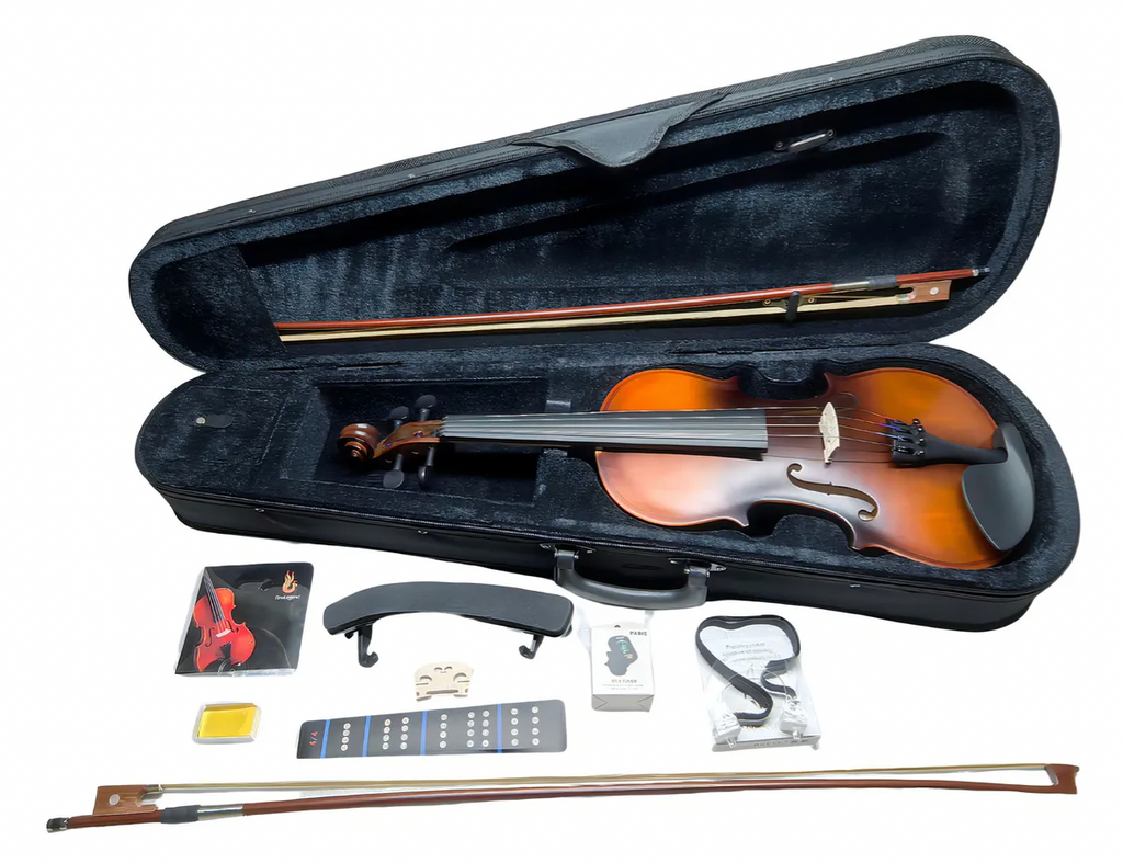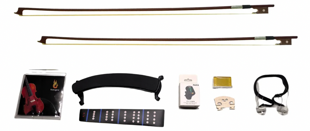 Este modelo MV012P-AM4-4-4 incluye un conjunto completo de accesorios que facilitan la experiencia del músico. Viene con un arco, brea, afinador, cuerdas, desansador de hombro y guías para el arco y las notas, asegurando que tengas todo lo necesario para comenzar a tocar de inmediato. El diapasón de granadillo proporciona una excelente respuesta y durabilidad, lo que lo convierte en un instrumento confiable para el uso diario.